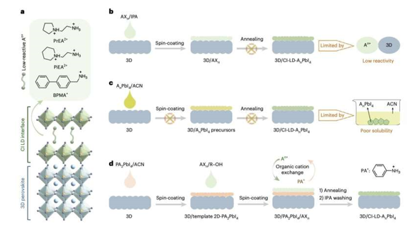 Рао Хайся, Е Сеньюнь и их коллеги отмечают в статье: « Сочетание низкореактивных объемных катионов на границе раздела галогенированных металлатов CI LD может решить проблему компромисса между эффективностью и стабильностью в перовскитных солнечных элементах (PSC). Однако его образование сталкивается с препятствиями, во-первых, низкой реактивностью объемных катионов и ограниченной растворимостью его прекурсоров в ортогональных растворителях, совместимых с нижним перовскитом. С этой целью исследовательская группа внедрила стратегию селективного роста шаблона, используя традиционный метастабильный интерфейс LD в качестве шаблона для управления более стабильным ростом интерфейса CI LD посредством процесса органического катионного обмена.